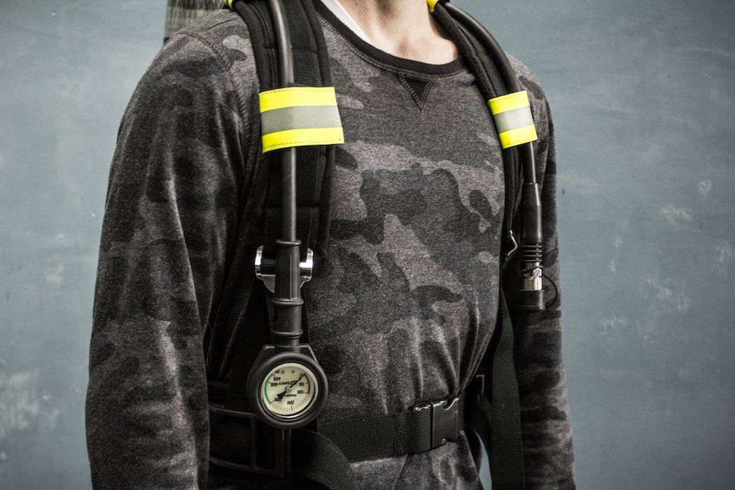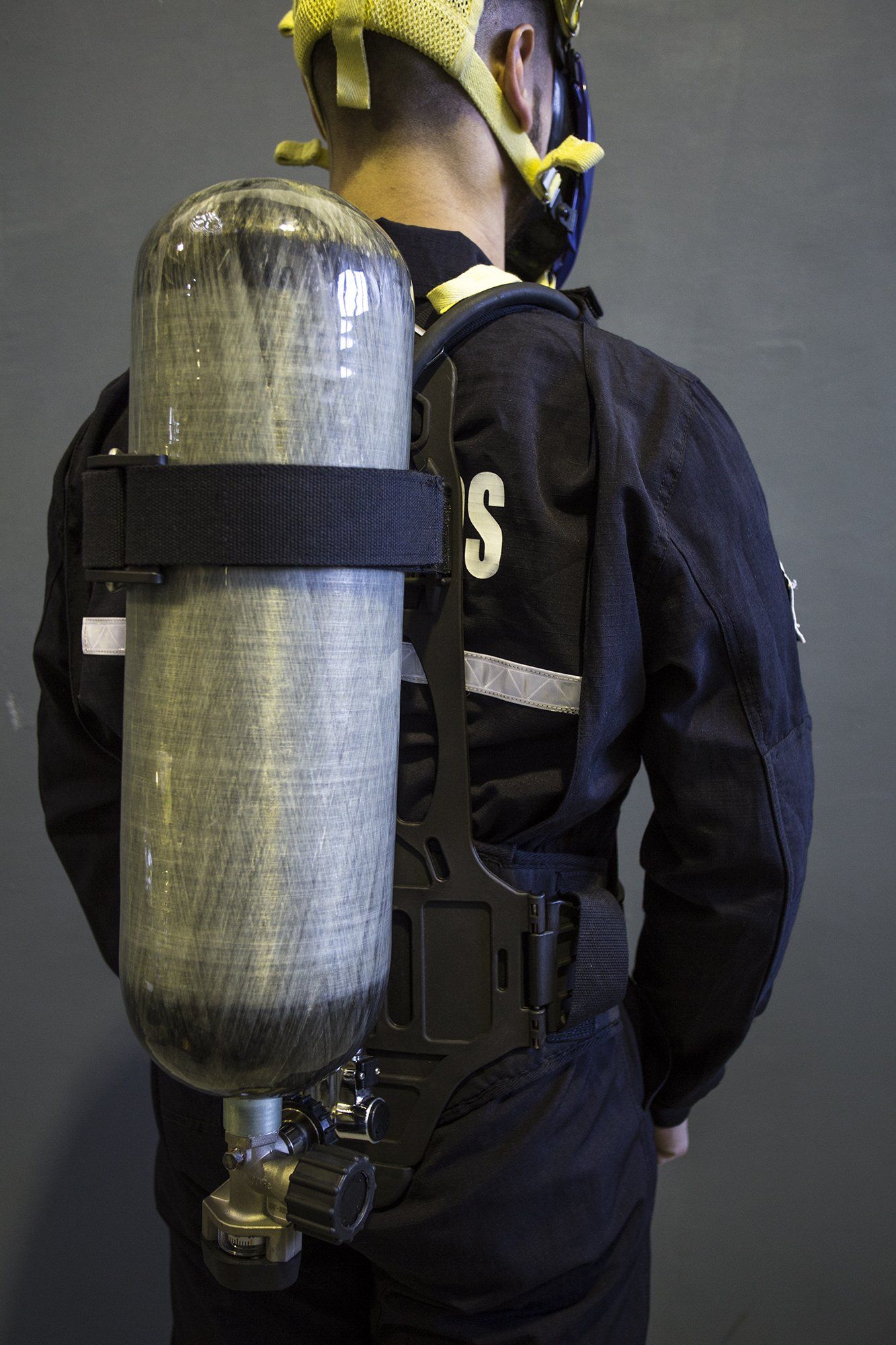 Arnês: Ergonômico, injetado com material resistente ao fogo e fibra de carbono, back pack compacto, leve, de alta resistência mecânica. Ele é projetado para fixar as costas do corpo humano, resguardando ergonomia e conforto. Possui engate para pulmão automático. Todos os componentes são resistentes ao fogo.