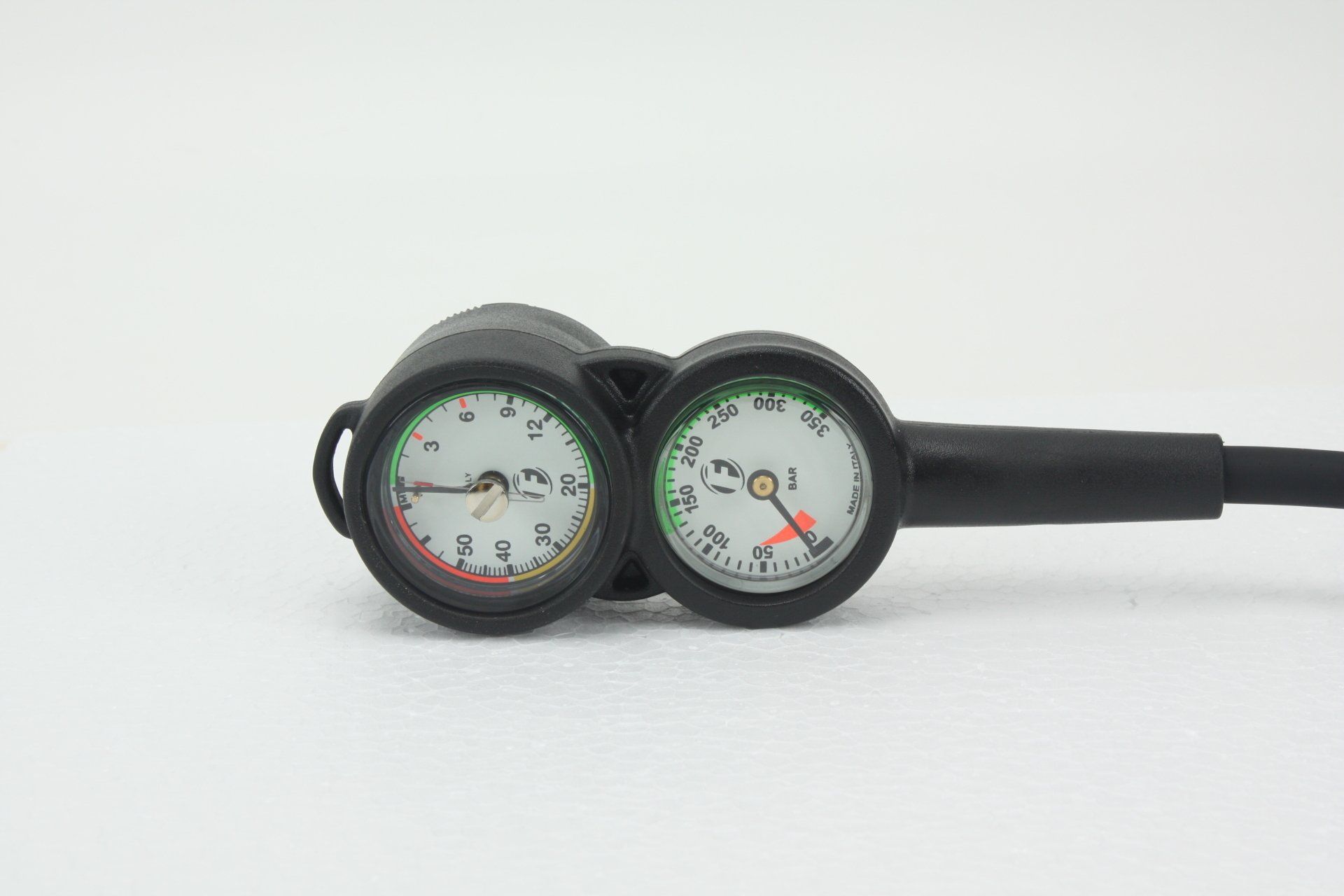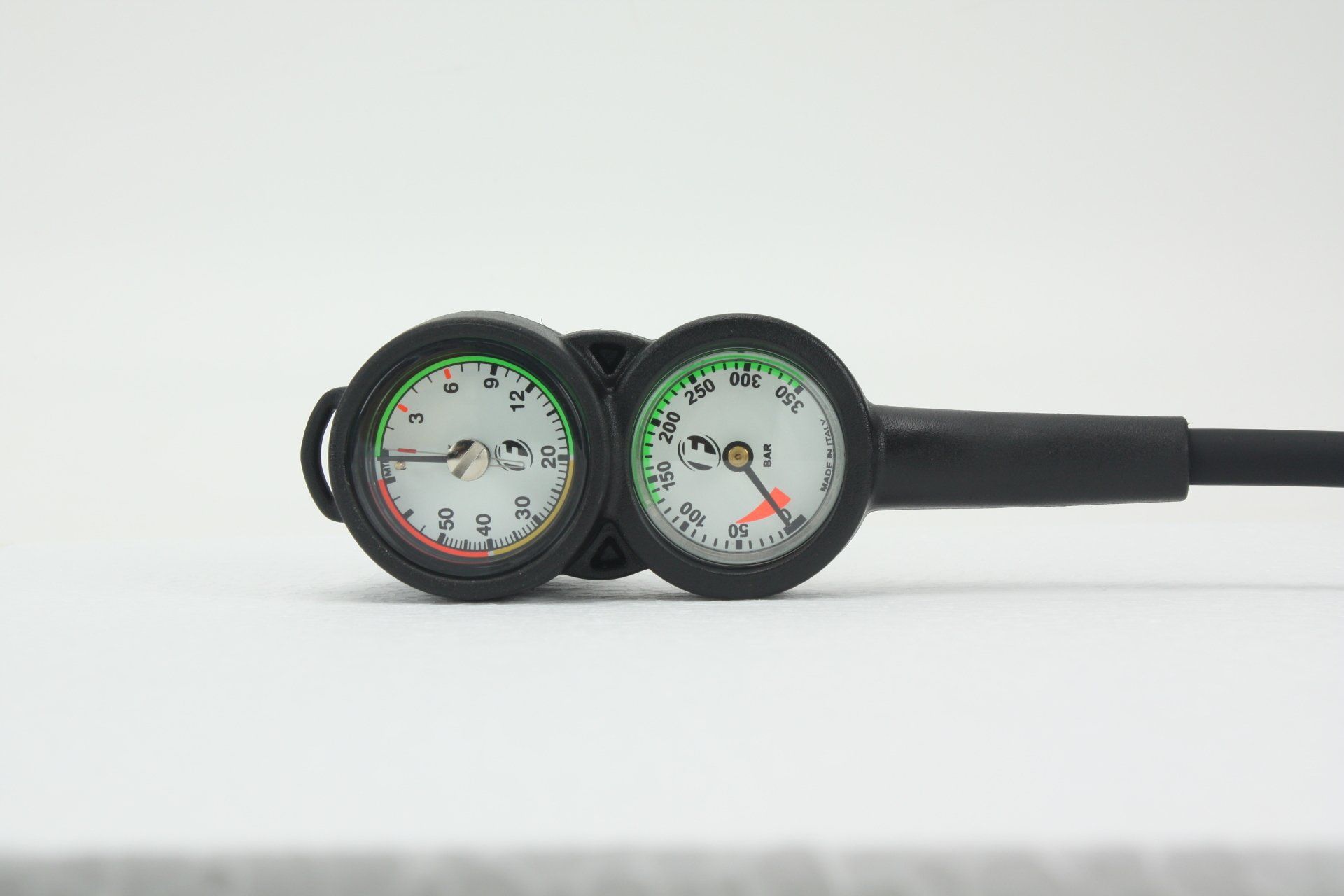 Marcação em verde, amarelo e vermelho conforme a profundidade Agulha que registra a profundidade máxima do mergulho